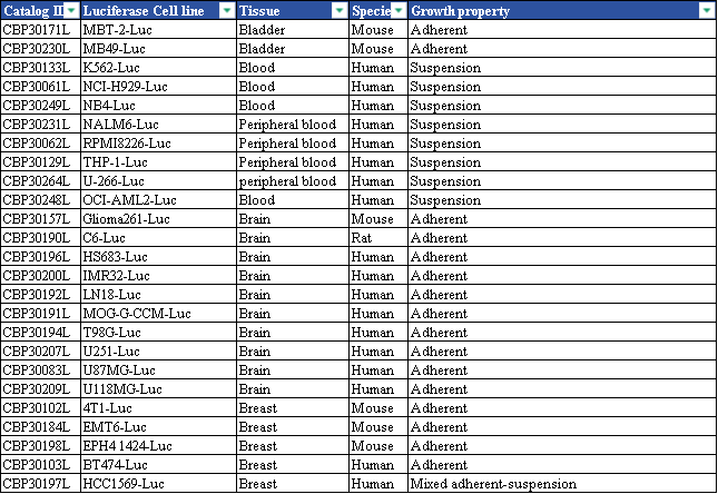 表7. 科佰生物部分現(xiàn)貨示蹤Luc細(xì)胞的清單展示