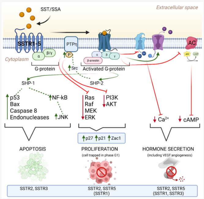 SSTR2與其它同家族受體一樣,在結(jié)合內(nèi)源性多肽配體SST后可以與Gi蛋白偶聯(lián),通過(guò)調(diào)節(jié)腺苷酸環(huán)化酶活性進(jìn)而抑制環(huán)腺苷酸的合成,將外源信號(hào)傳遞至胞內(nèi),從而參與調(diào)節(jié)多種激素的分泌,抑制細(xì)胞生長(zhǎng)增殖。SSTR還能激活K通道,促進(jìn)細(xì)胞膜超極化,抑制門控Ca2+通道的激活,進(jìn)而阻礙Ca2+內(nèi)流,抑制胞吐,抑制荷爾蒙的分泌功能。當(dāng)SSTR2或其它亞型與SST結(jié)合后,可以通過(guò)蛋白酪氨酸磷酸途徑,SSTR導(dǎo)致蛋白酪氨酸磷酸酶(PTP)上調(diào),使酪氨酸激酶去磷酸化而失活,并抑制促絲裂原活化蛋白激酶(MAPK)等多種蛋白激酶,抑制癌基因、c-fos、c-mys、c-jun等轉(zhuǎn)錄激活,從而抑制DNA和蛋白質(zhì)的合成。