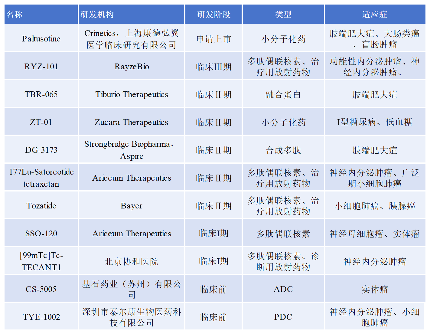 最近,賽諾菲獲得了Zucara Therapeutics公司靶向SSTR2的Ⅰ型糖尿病新藥ZT-01的優(yōu)先談判權(quán)。目前,關(guān)于SSTR2靶點(diǎn)有多種藥物在開(kāi)發(fā),部分在研藥物進(jìn)展如下: