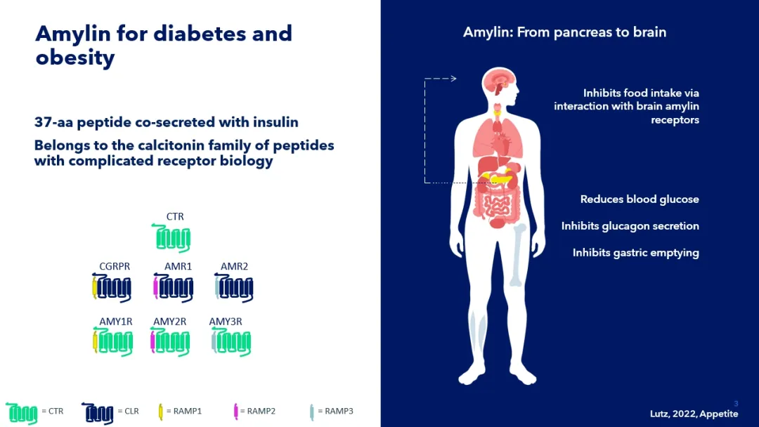 胰淀素(Amylin)是胰島β細胞分泌的"智能激素",和胰島素是好搭檔。胰淀素要發(fā)揮作用,必須找到它的專屬"接收器"——胰淀素受體(AMYR)。該受體由降鈣素受體(CTR)與受體活性修飾蛋白(RAMP1、RAMP1和 RAMP3)異源二聚化形成。