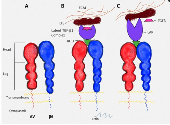 整合素αvβ6特異的配體主要配體包括細胞外基質(zhì)蛋白如纖維連接蛋白(Fibronectin)、層粘連蛋白(Laminin)以及潛活形式的TGF-β。潛伏期相關(guān)肽(LAP)是轉(zhuǎn)化生長因子β(TGF-β)前體肽的氨基末端結(jié)構(gòu)域,形成潛在的 TGF-β 復合物,并充當整合素 αvβ6 的配體。當整合素 αvβ6 通過LAP與細胞外位點的潛在TGF-β復合物結(jié)合時,同時與細胞內(nèi)細胞骨架結(jié)合時,活性TGF-β從潛在復合物中釋放出來,驅(qū)動纖維化和免疫抑制微環(huán)境形成;此外,αvβ6還可作為口蹄疫病毒(FMDV)等病原體的入侵受體。