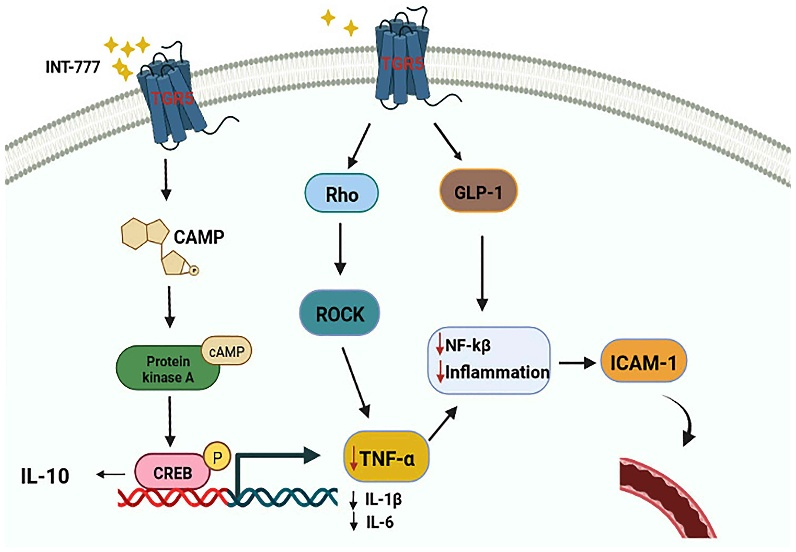 有報道稱,在慢性炎癥反應(yīng)中,TNF-α可激活多種半胱天冬酶,導(dǎo)致炎癥細(xì)胞凋亡。TGR5已被發(fā)現(xiàn)通過調(diào)節(jié)Rho/Rho相關(guān)蛋白激酶(ROCK)信號通路來調(diào)節(jié)TNF-α。作為TGR5的激動劑,INT-777可以阻斷TNF-α誘導(dǎo)的RMEC增殖和遷移,抑制TNF-α促進血管通透性的作用。此外,已有證據(jù)表明,TGR5激動劑可以通過激活TGR5- camp蛋白激酶A (PKA)信號通路,上調(diào)IL-10的表達,發(fā)揮抗炎和免疫抑制作用,降低促炎細(xì)胞因子IL-1β、IL-6和TNF-α的表達。有研究表明,GLP-1可通過抑制NF-κB延緩ECs的損傷,進而抑制IL-1β、IL-6、TNF-α等炎癥因子的分泌。而各種研究證實GLP-1是TGR5的靶點之一;其分泌依賴于TGR5。因此,推測激活TGR5可能是刺激GLP-1分泌、延緩RMEC損傷的有效途徑。