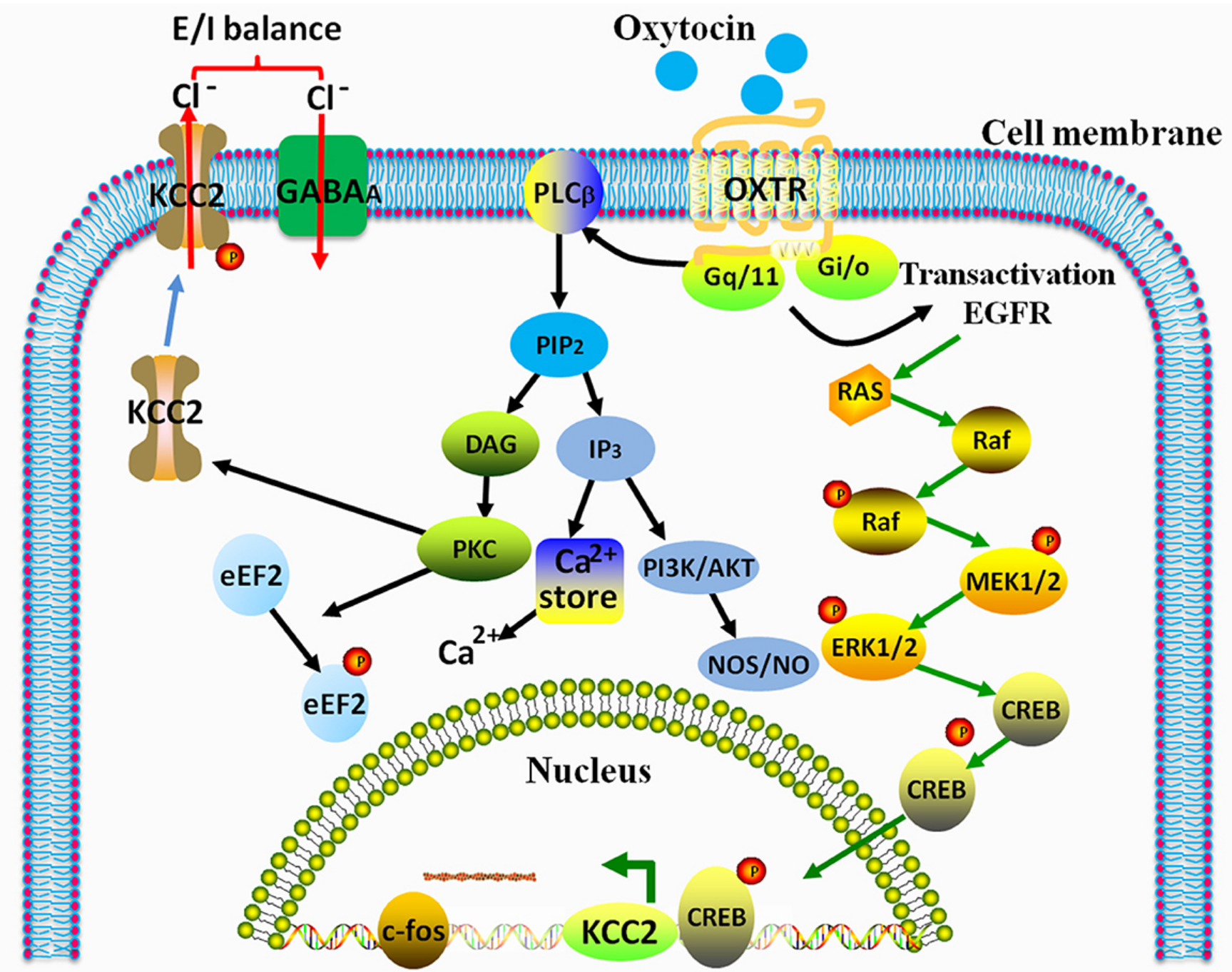 催產(chǎn)素(OXT)是大腦中由下丘腦室旁核(PVN)和視上核(SON)產(chǎn)生的神經(jīng)肽,主要作為外周系統(tǒng)中的激素,可促進母乳喂養(yǎng)時的乳汁分泌,調(diào)節(jié)分娩時的子宮收縮,緩解疼痛和促進分娩過程,促進傷口愈合。此外,中樞神經(jīng)系統(tǒng)(CNS)中的 OXT 系統(tǒng)在社會認可、社交行為、焦慮相關(guān)行為和自主神經(jīng)功能中起著重要作用,例如母體行為、攻擊性、交配、依戀和性行為。除了促社會效應(yīng)外,OXT 還被確定為大腦中重要的抗應(yīng)激和抗焦慮因子,通過其靶受體(催產(chǎn)素受體,OXTR)激活細胞內(nèi) MEK/ERK 信號傳導(dǎo)。