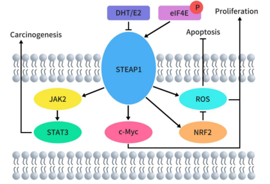 STEAP2,又被稱(chēng)為前列腺六跨膜蛋白 1(STAMP1),是一種由 490 個(gè)氨基酸組成的(56.1 kDa)蛋白質(zhì),其在高爾基體復(fù)合體、跨高爾基體網(wǎng)絡(luò)以及質(zhì)膜中高度表達(dá)。這表明 STEAP2 參與了某些內(nèi)吞和外排運(yùn)輸途徑。STEAP2 有助于紅細(xì)胞中 Fe3+ 和 Cu2+ 的正常攝取,并將其還原為 Fe2+ 和 Cu+,從而促進(jìn)轉(zhuǎn)鐵蛋白循環(huán)的進(jìn)行。通過(guò)激活 ERK 通路,STEAP2 誘導(dǎo)癌細(xì)胞在 G0-G1 細(xì)胞周期階段的部分停滯,從而增加細(xì)胞增殖和腫瘤發(fā)展。