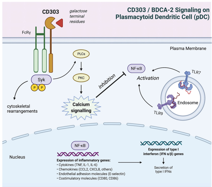 BDCA-2 (blood DC antigen 2血液樹突狀細(xì)胞抗原2)又叫CLEC4C或CD303,是人類pDCs特有的II型c型凝集素受體(CLR),與TLR-7/9協(xié)同識(shí)別微生物和協(xié)調(diào)炎癥免疫反應(yīng)。BDCA-2是一種可溶性跨膜糖蛋白,由聚集在12號(hào)染色體上的c型凝集素編碼基因編碼,包括KLRG1和CLEC4A。與其他CLR類似,BDCA-2具有單個(gè)胞外碳水化合物識(shí)別結(jié)構(gòu)域,并且在其短細(xì)胞質(zhì)尾部缺乏固有的信號(hào)基序。BDCA-2選擇性地與IgG分子上的半乳糖端聚糖結(jié)合,產(chǎn)生抗炎反應(yīng)來抵抗因?yàn)橥ㄟ^抗原吸收、內(nèi)化、呈遞給T細(xì)胞以及信號(hào)通路如IFN-I,NF-kB等其他炎性體激活。BDCA-2與跨膜區(qū)的FcRγ鏈形成adaptor,允許酪氨酸激酶募集磷酸化以及鈣動(dòng)員,類似于b細(xì)胞受體(BCR)信號(hào)體,BDCA-2信號(hào)通過免疫受體酪氨酸激活發(fā)生基序(ITAM)介導(dǎo)的酪氨酸(Syk)磷酸化,磷脂酰肌醇特異性磷酯酶(PLCγ2),PKC的激活等誘導(dǎo)鈣流入并在pDC中充當(dāng)負(fù)調(diào)節(jié)劑,介導(dǎo)IFN-Ⅰ抑制并通過BDCA2觸發(fā)減少NFKB的激活。