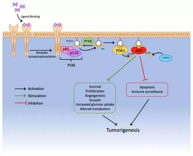 圖1. PTEN抑制PI3K途徑和AKT的下游致癌信號。通過使PIP3磷酸化,PTEN阻止了PDK1激活A(yù)KT,從而防止了腫瘤的發(fā)生。
